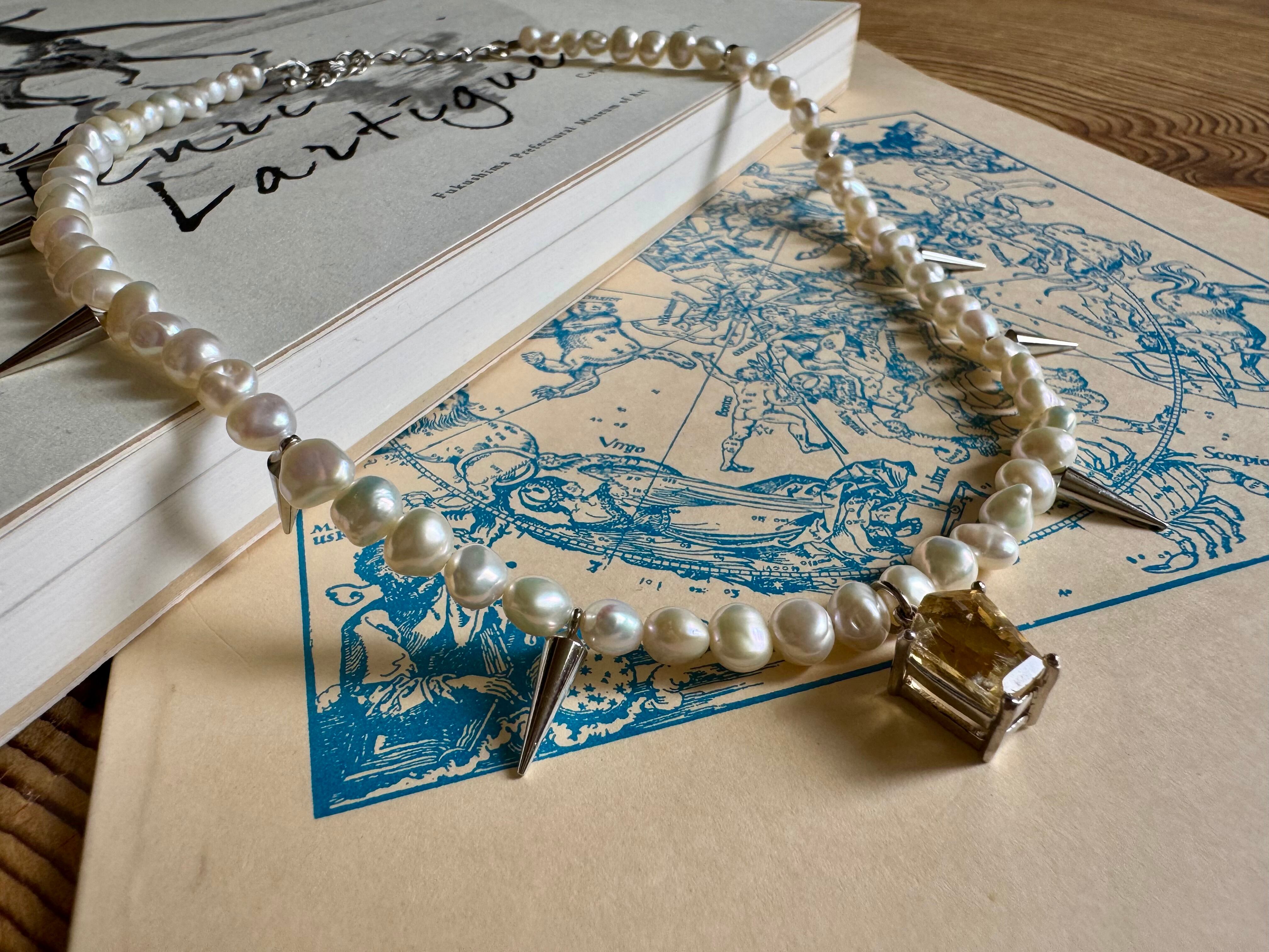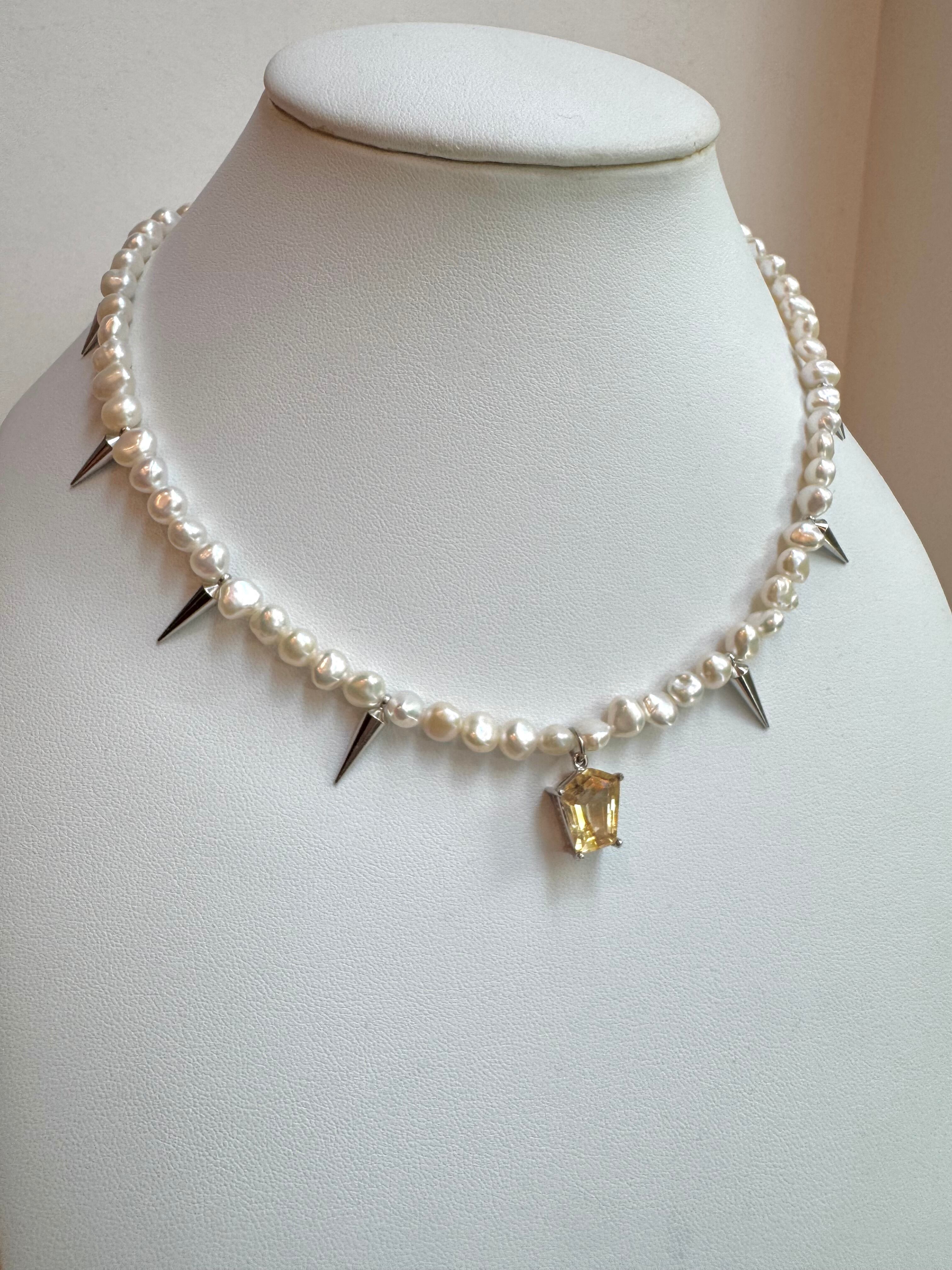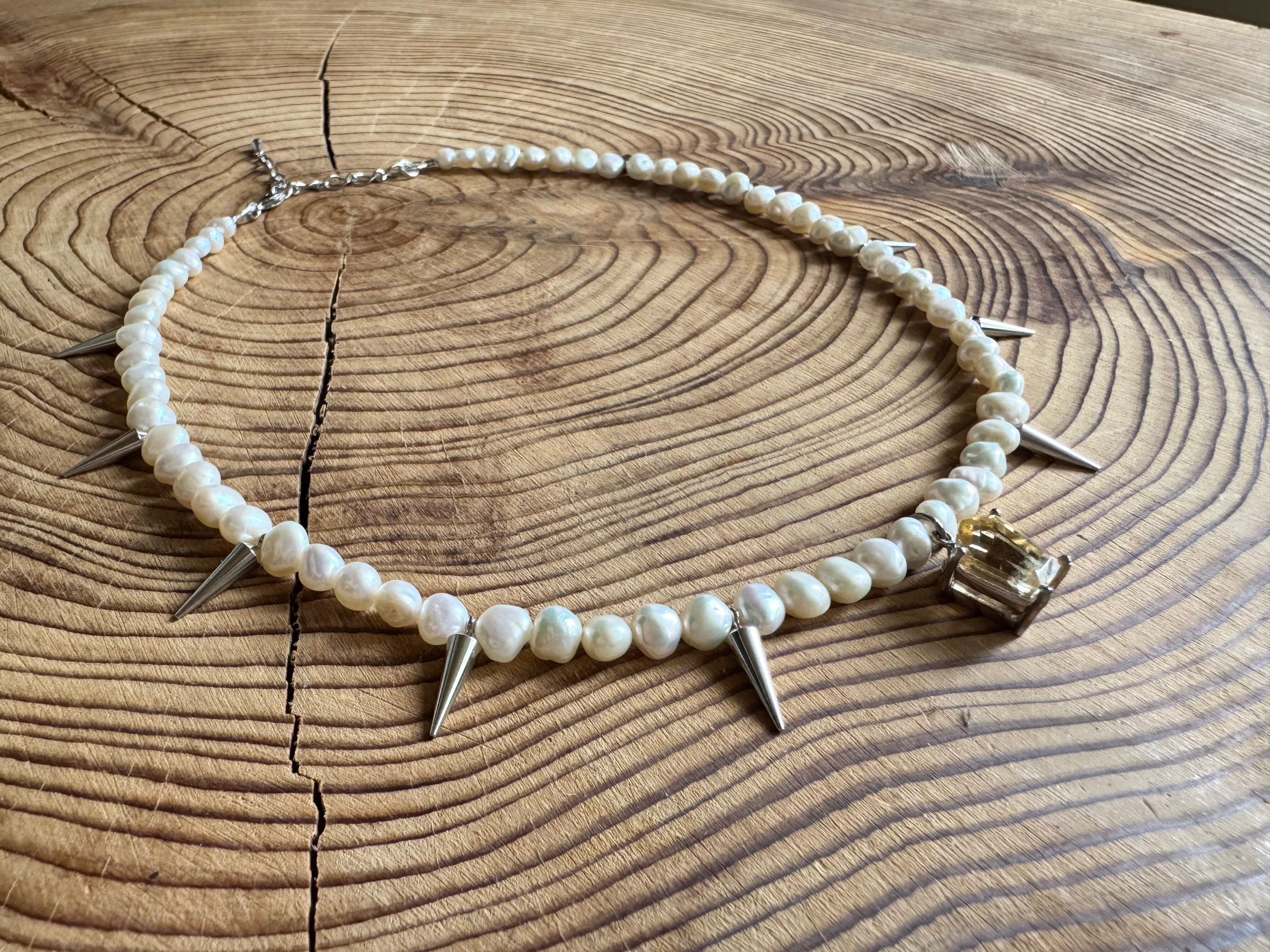 淡水パールと、スタッズを組み合わせたネックレスです。ペンダントトップには爽やかなイエローが美しいシトリンを合わせました。