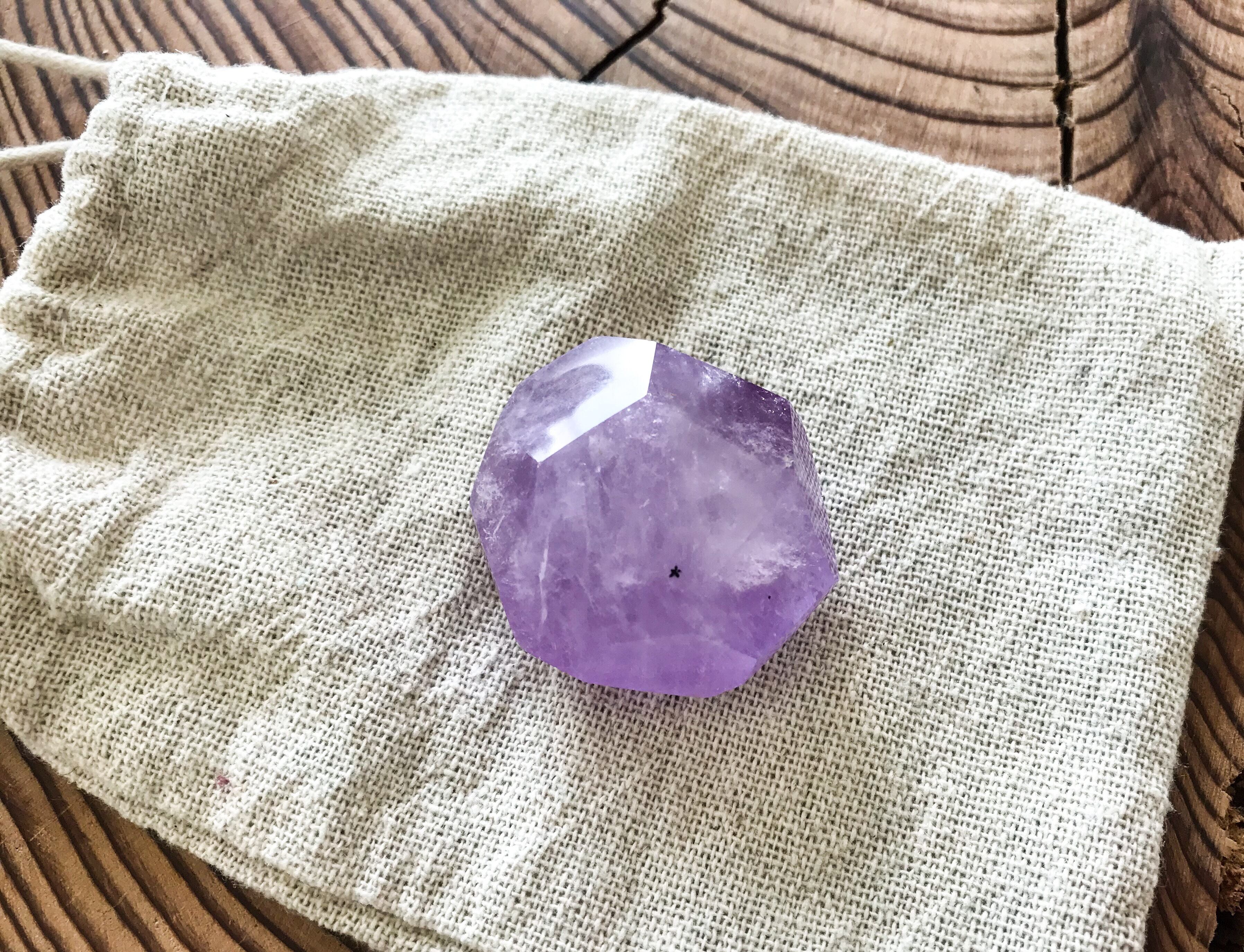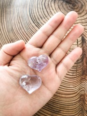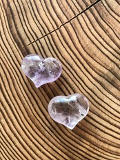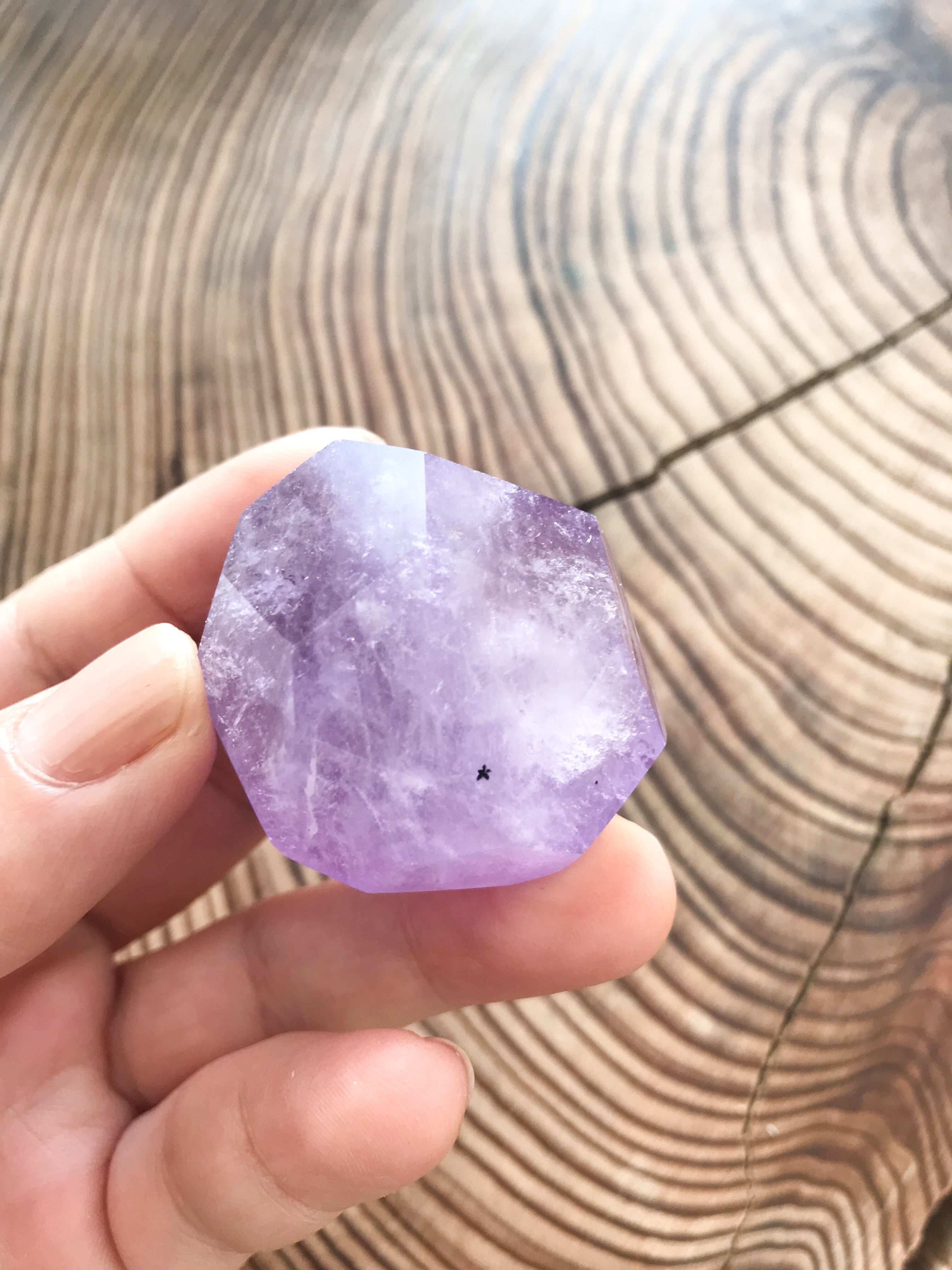 ライトカラーのアメジストの手のひらサイズのタンブルとハート型のアメジスト2つの、計3つのアメジストの愛らしいセットです。タンブルの方には星のように見える黒い小さな内包物がひとつ見えています。