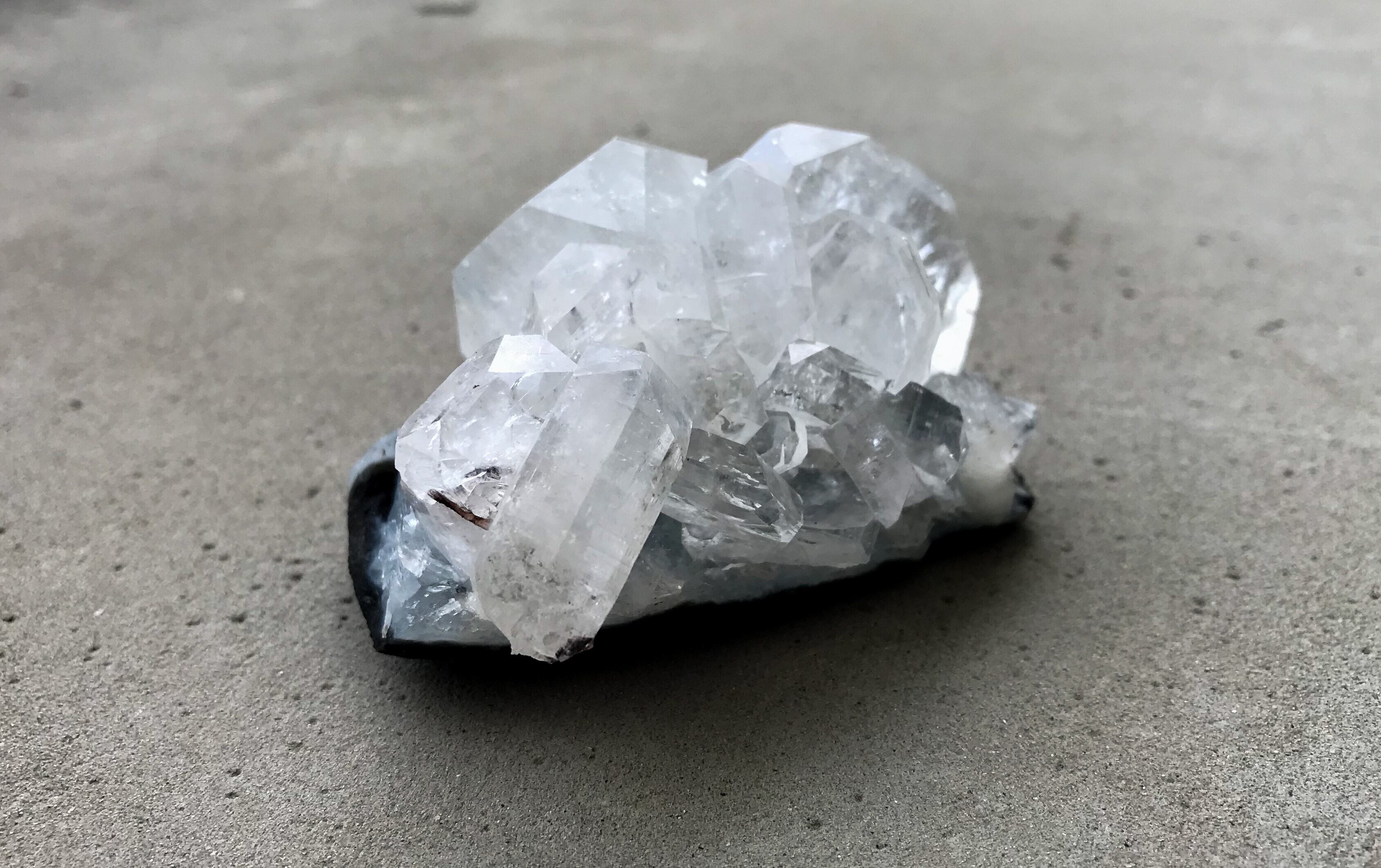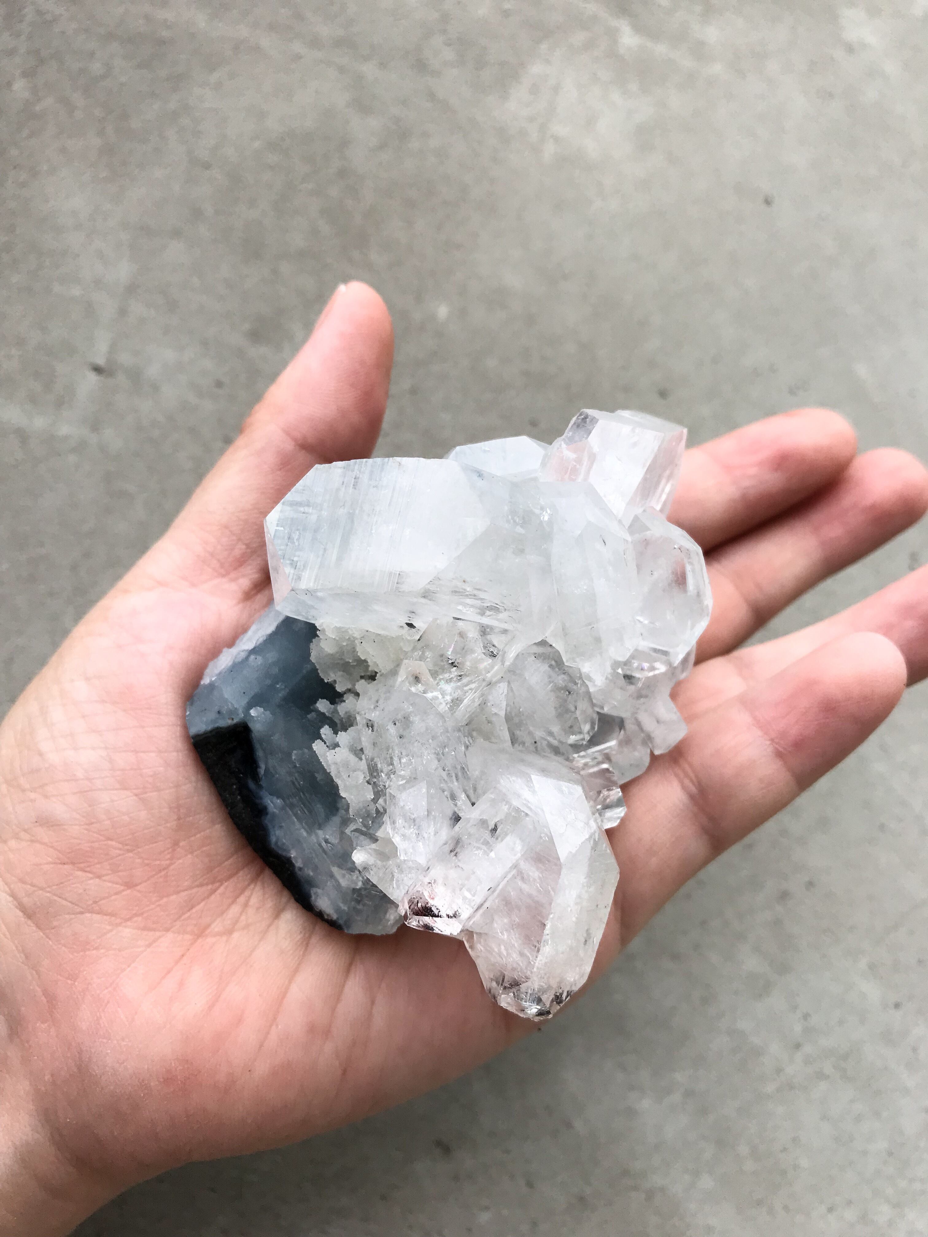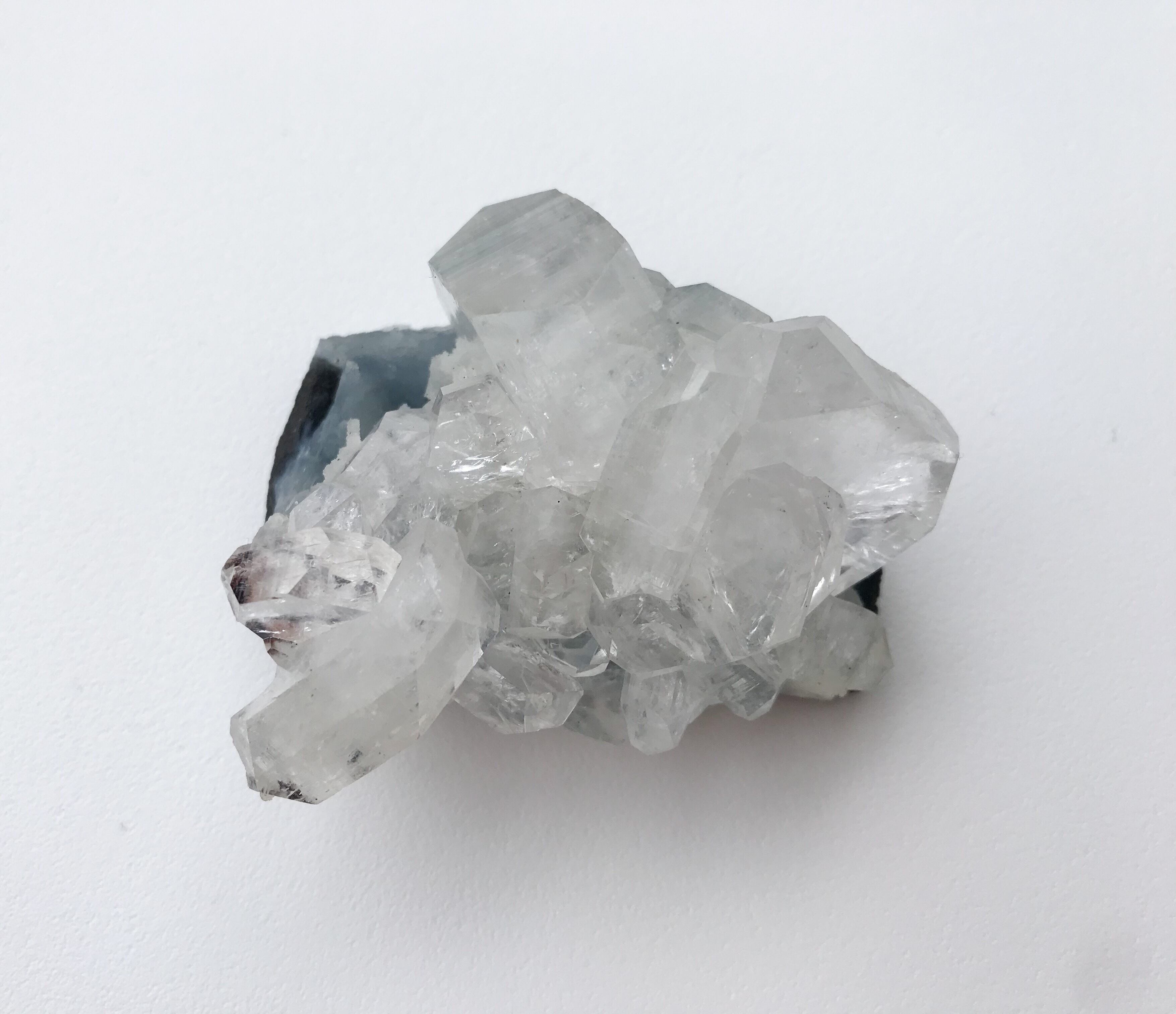 今回ご紹介するのはインド マハラシュトラ州 ナーシク産のとても美しいアポフィライト(魚眼石)、ブルーカルセドニーと共生しております。淡いブルーに白銀のアポフィライトがとても美しいです。