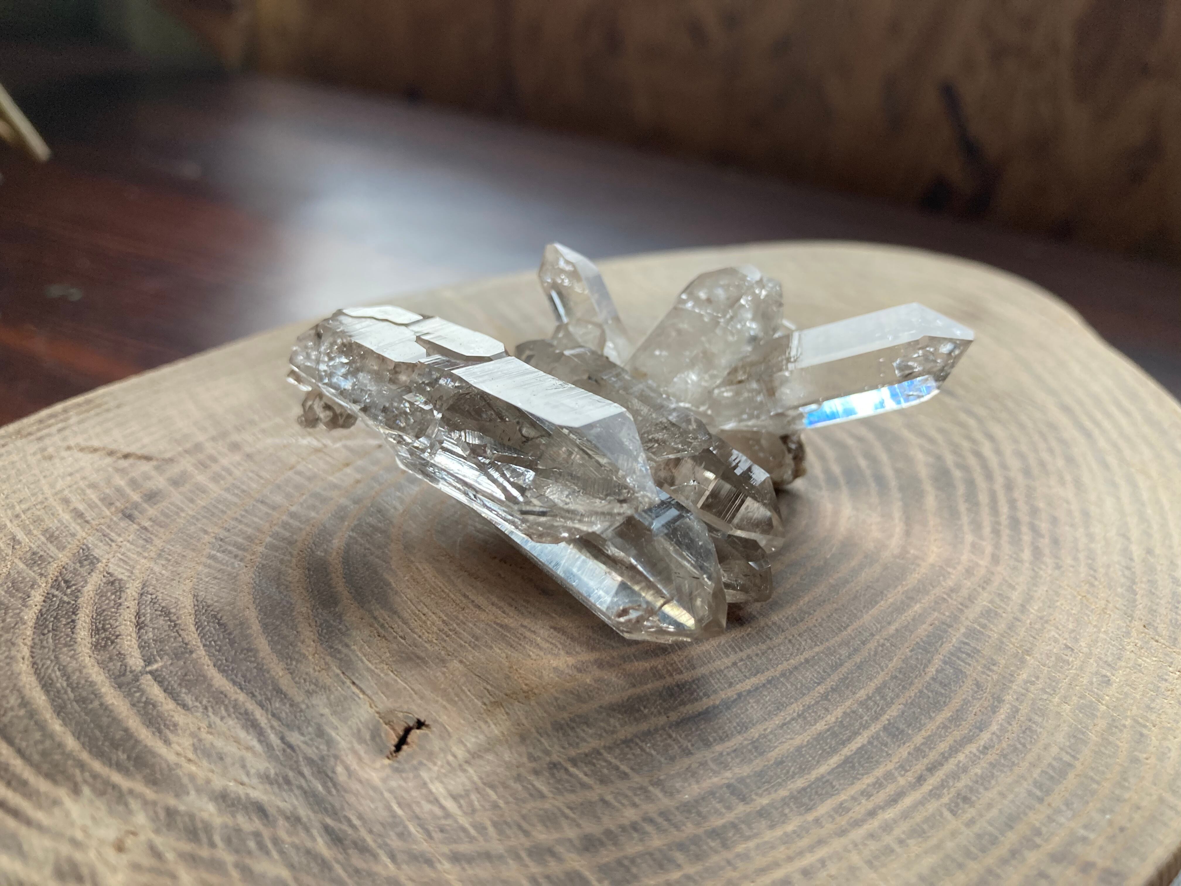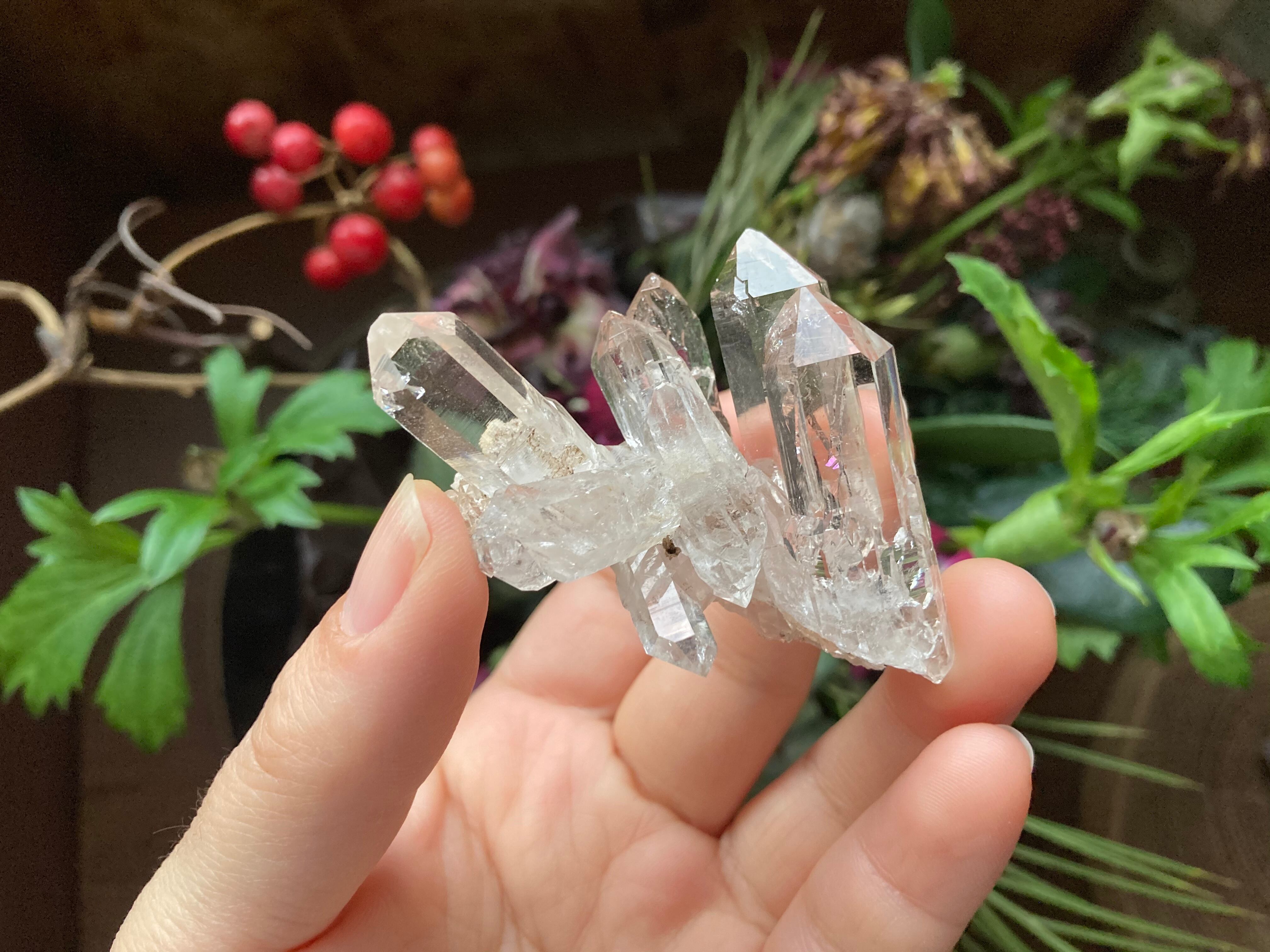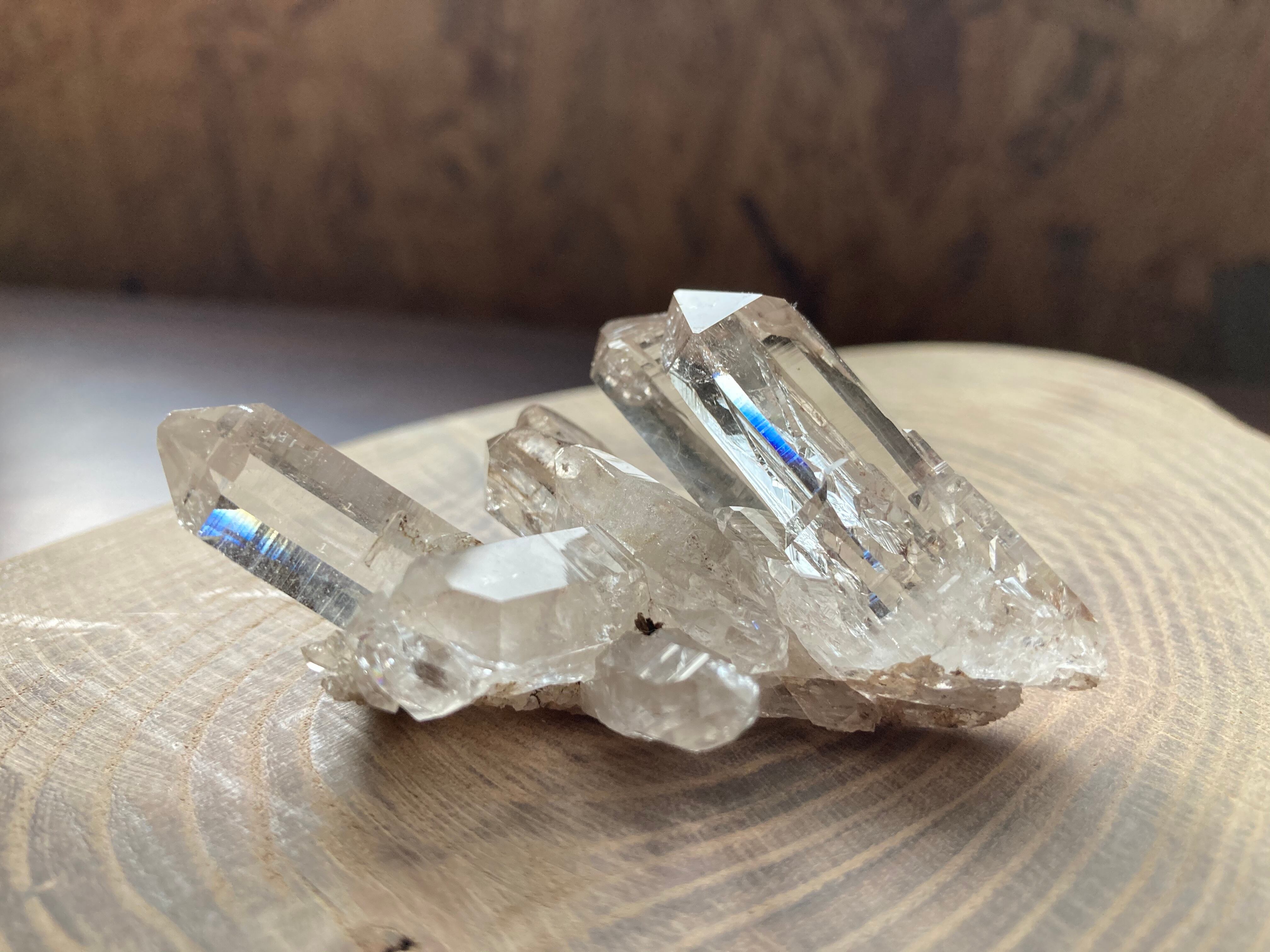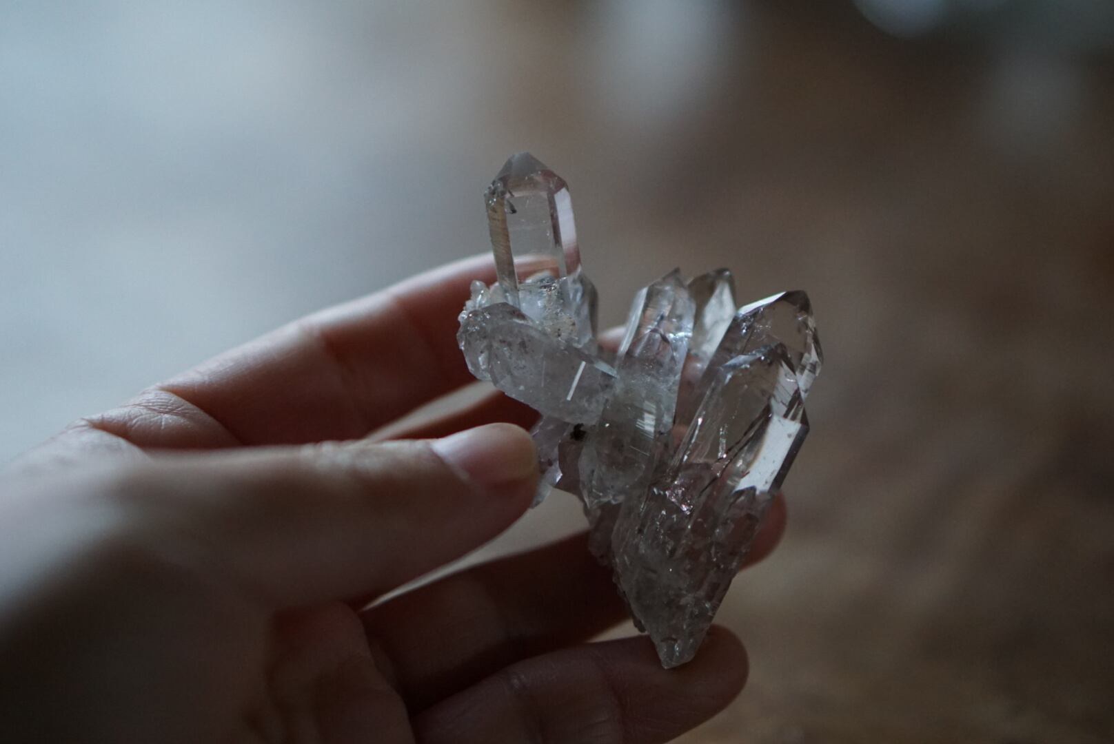 小さめサイズですが、眺めているだけで強力な光に照射されて清められるような印象の水晶クラスターです。