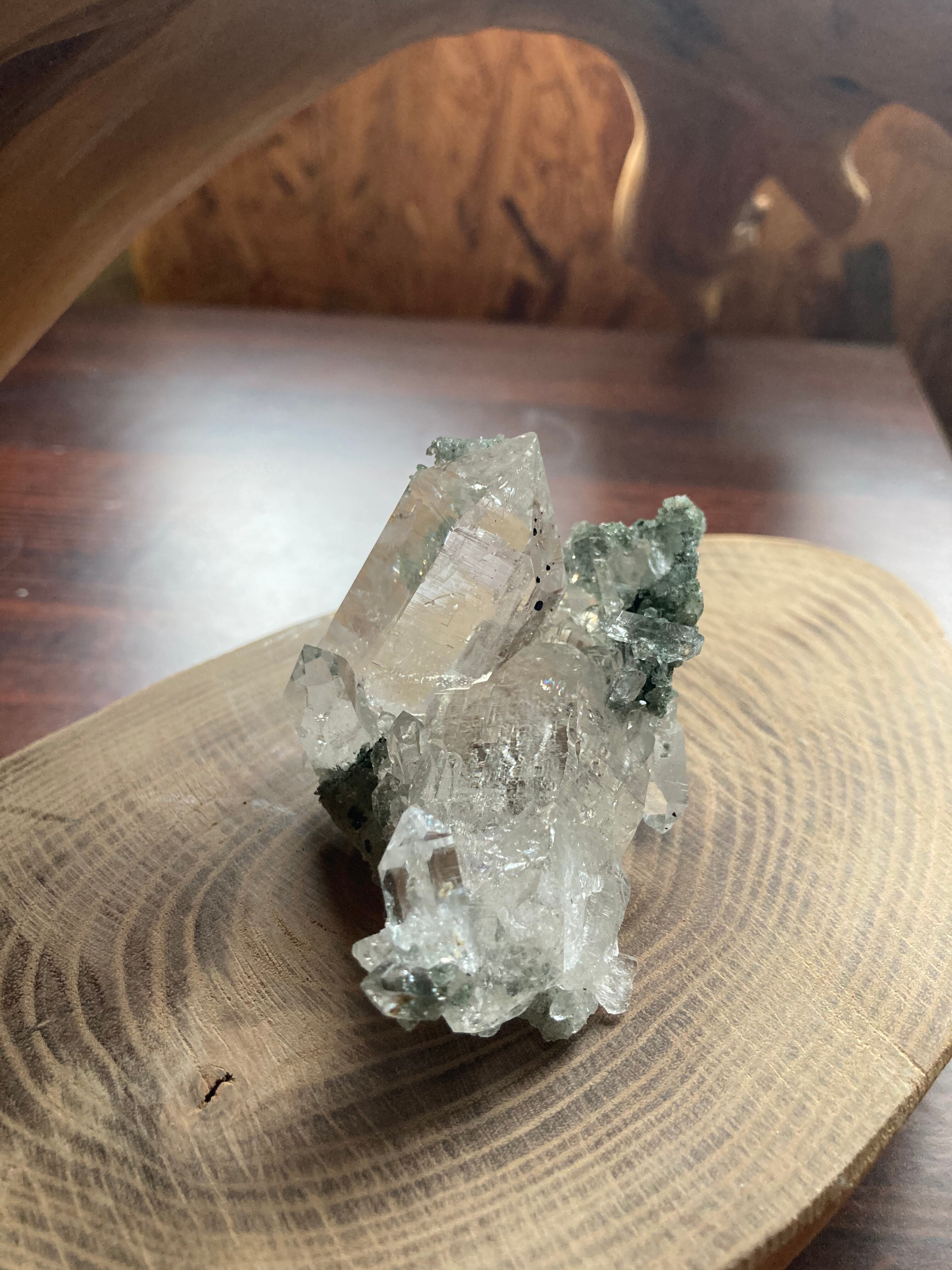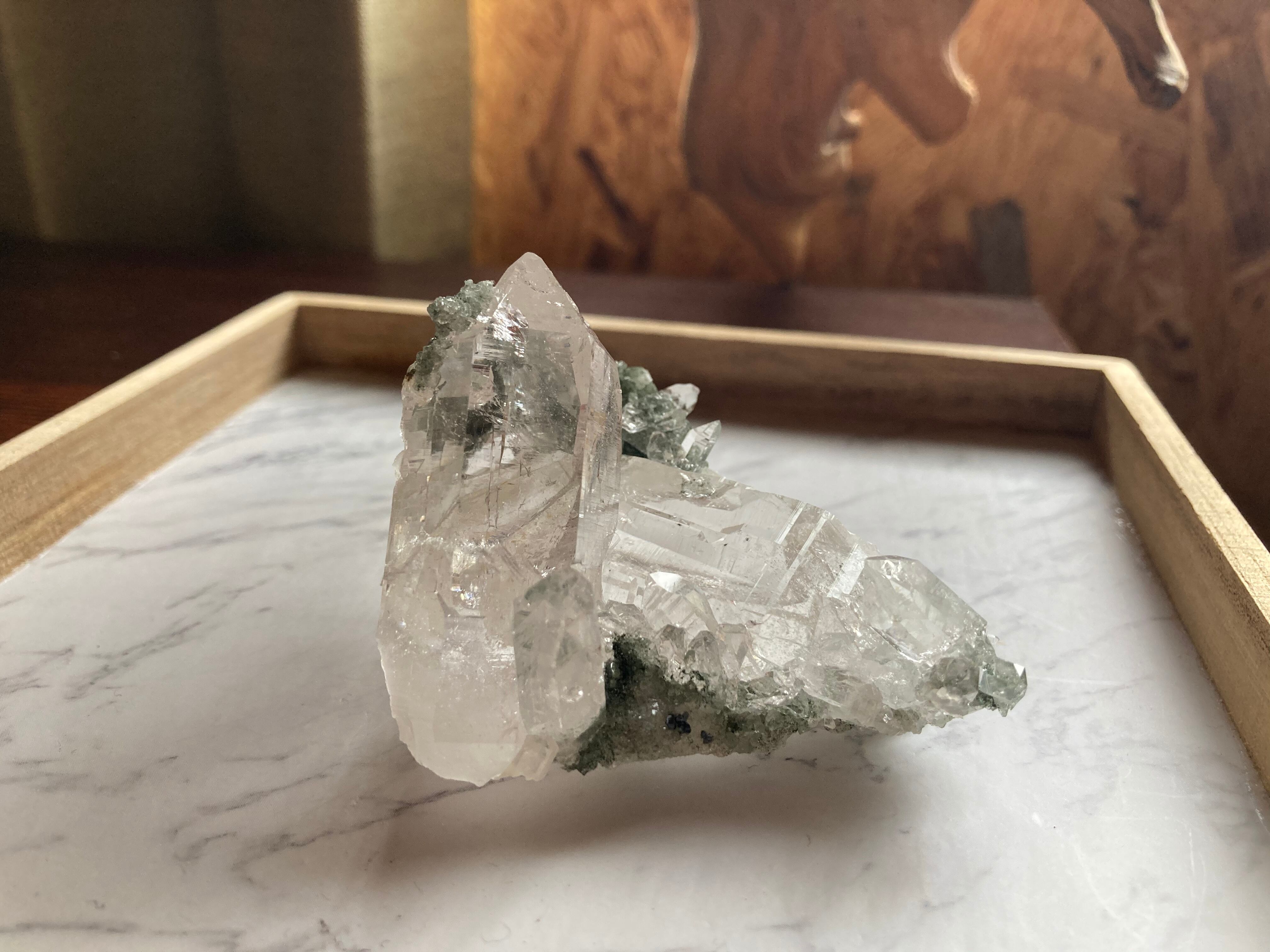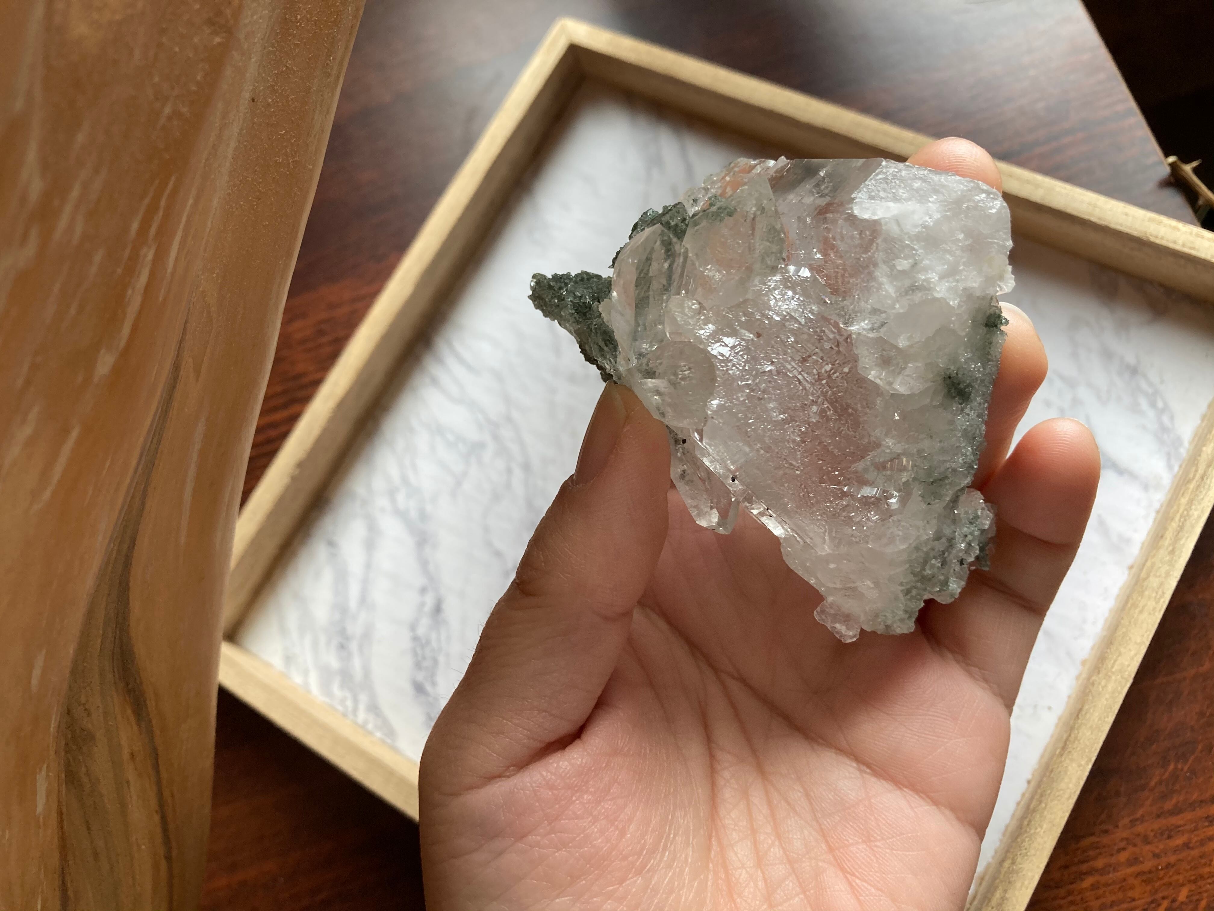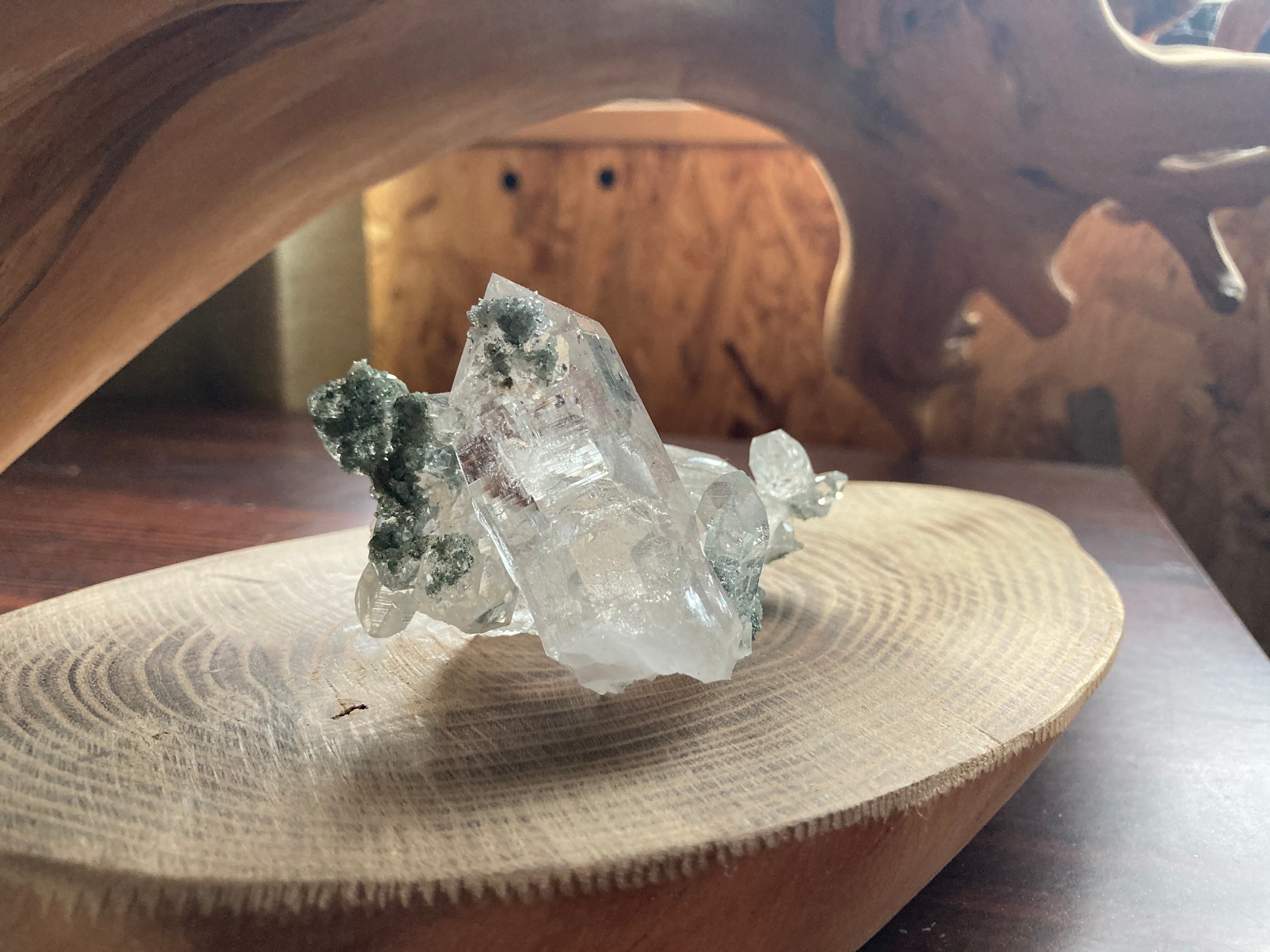 クローライトはモスアゲートやグリーンファントムに含まれる緑色の鉱物で、セラフィナイトとも同じ分類の石です。見た目にも優しく愛らしく、このグリーンを眺めているだけで癒されます。