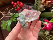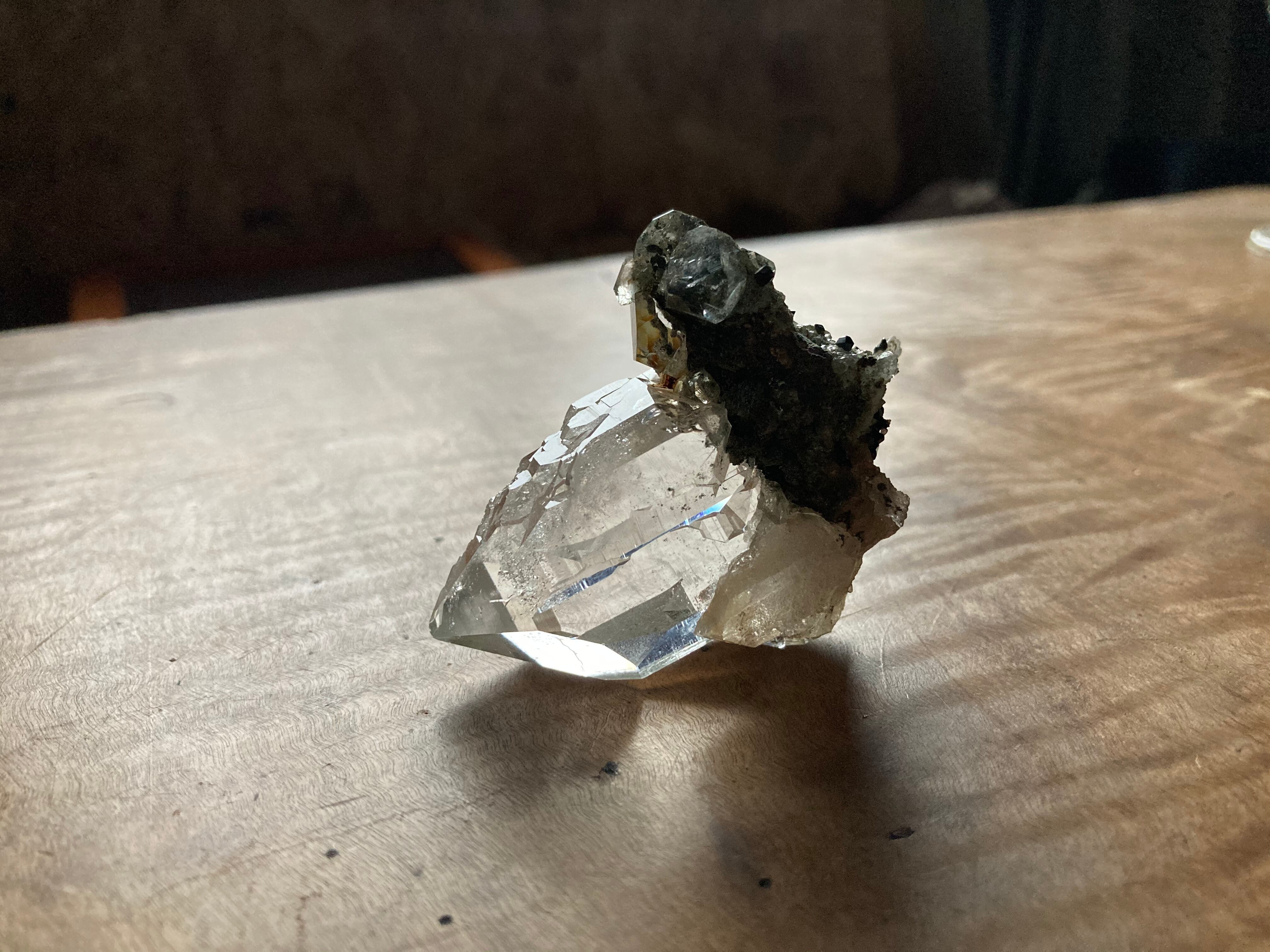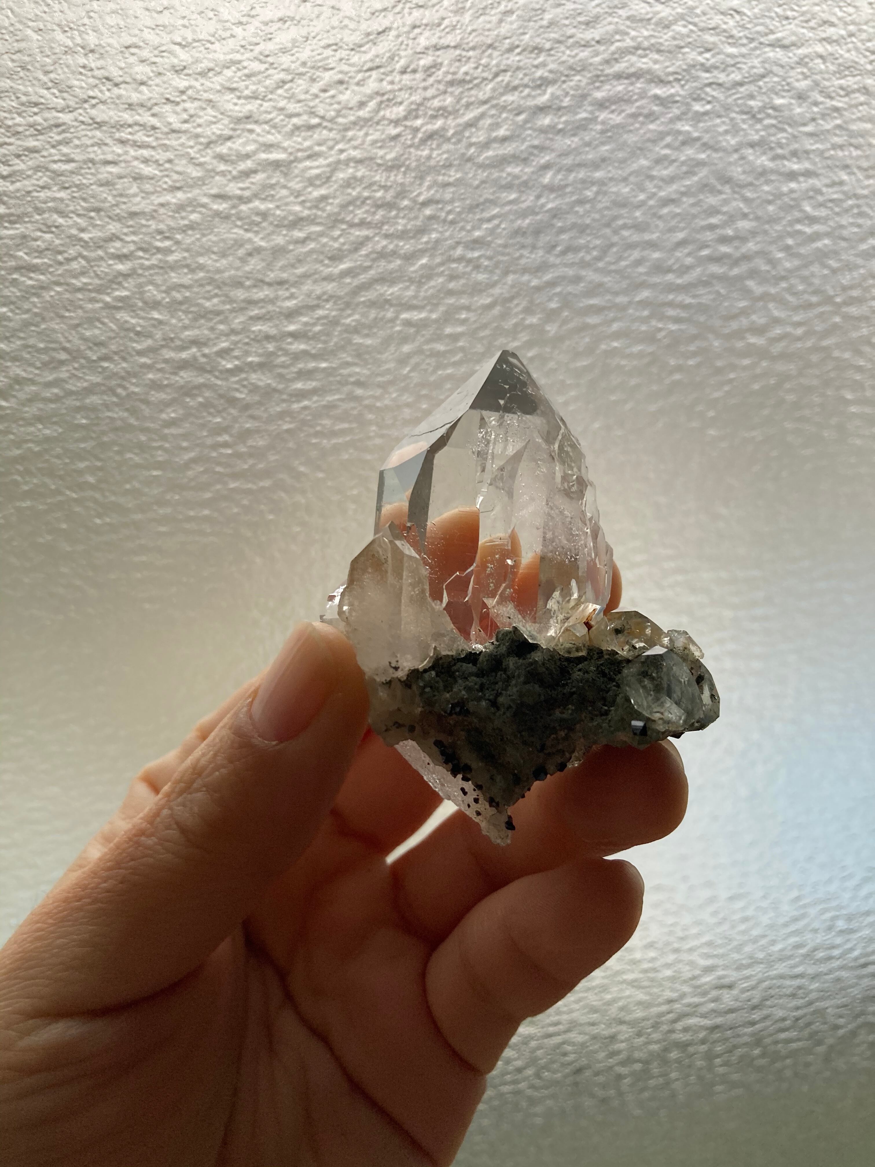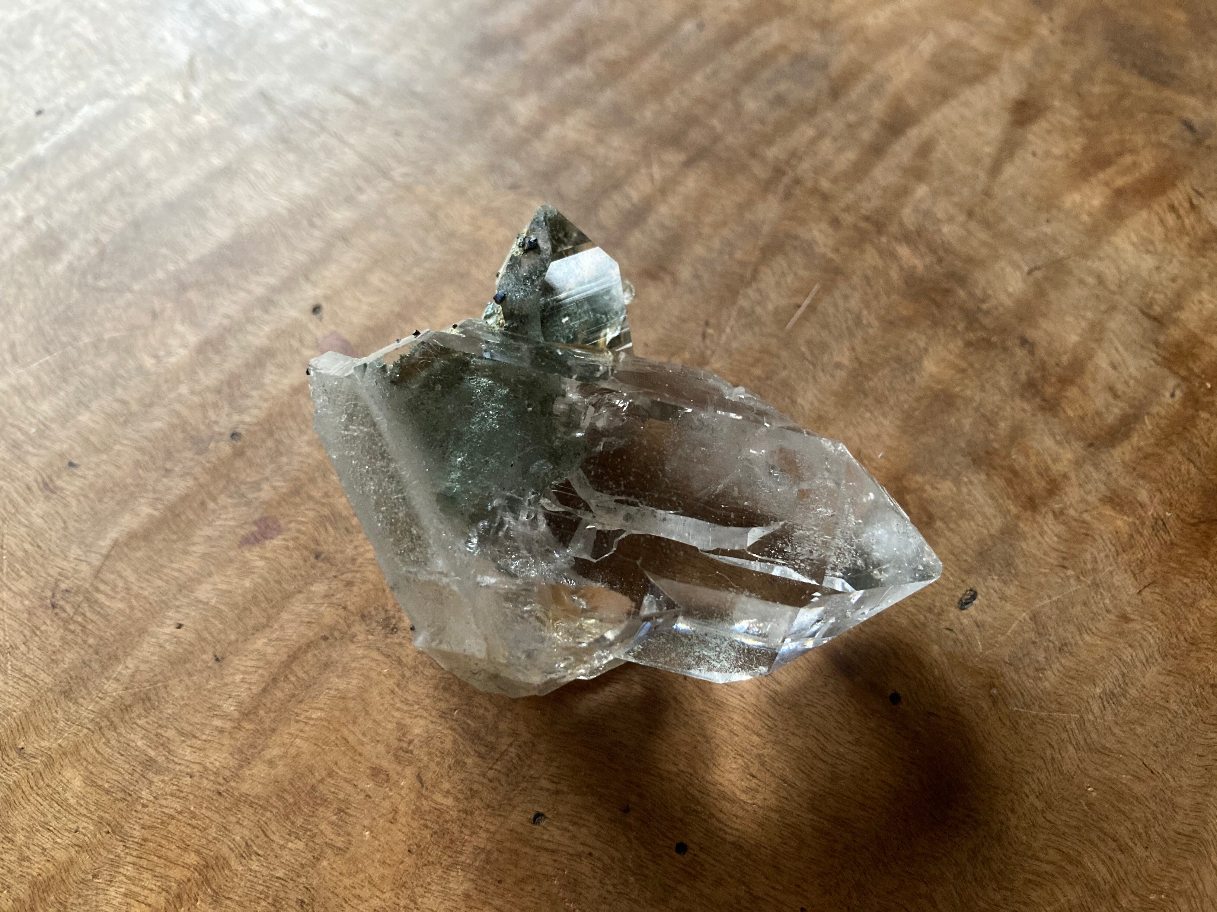 こちらの水晶はクローライトと共生しており、表面のところどころに黒くて小さなアナテーズが見えます。