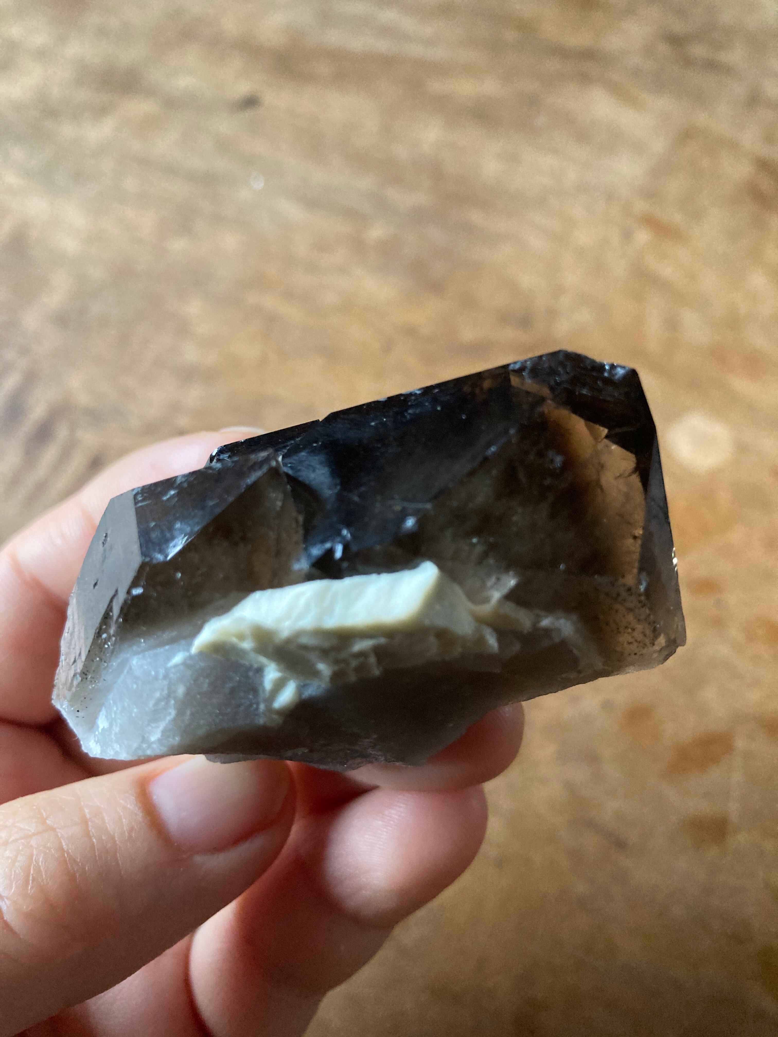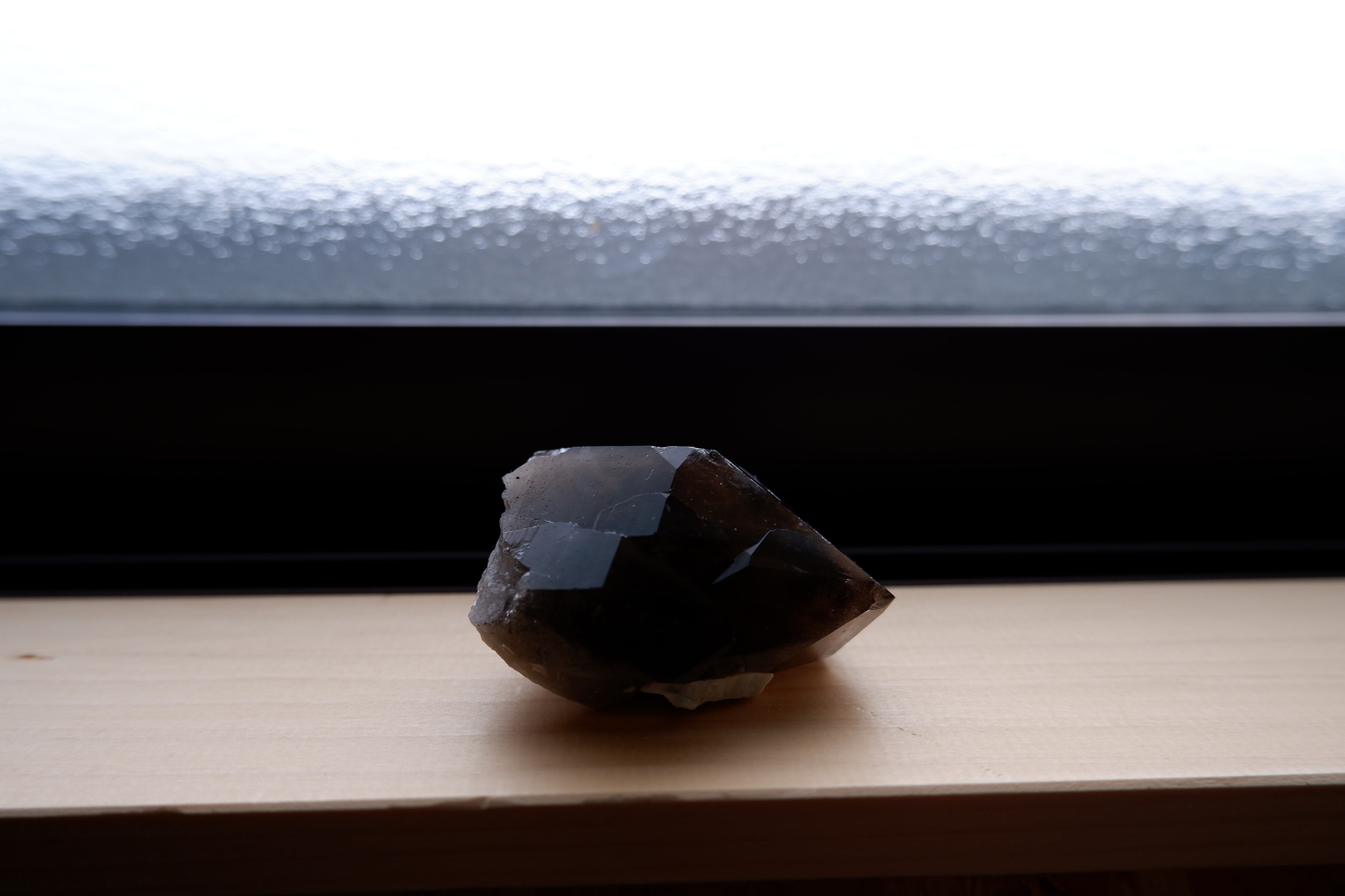 光にかざすと灰茶色に透けますが、ぱっと見はモリオンのような色の濃さです。