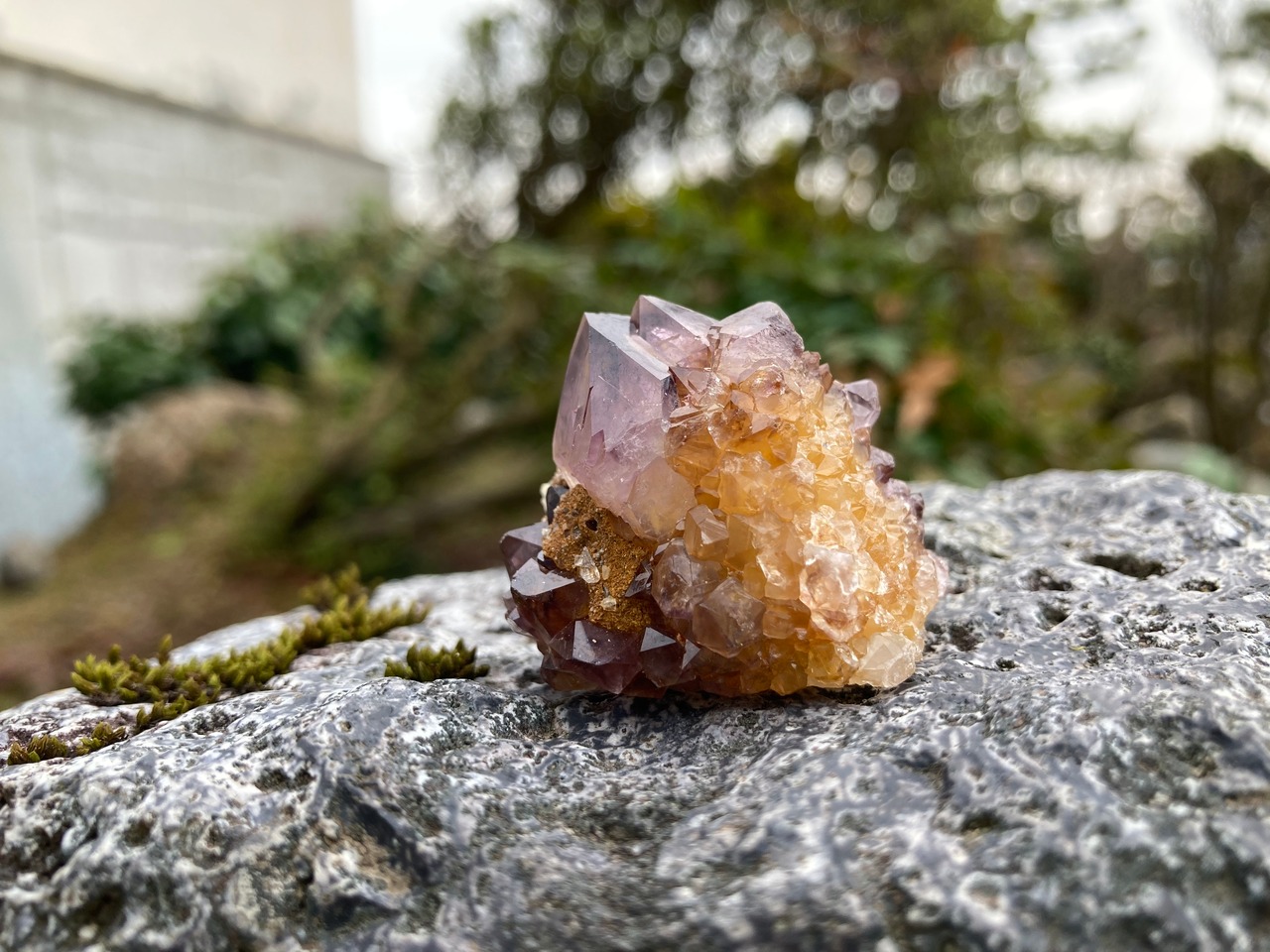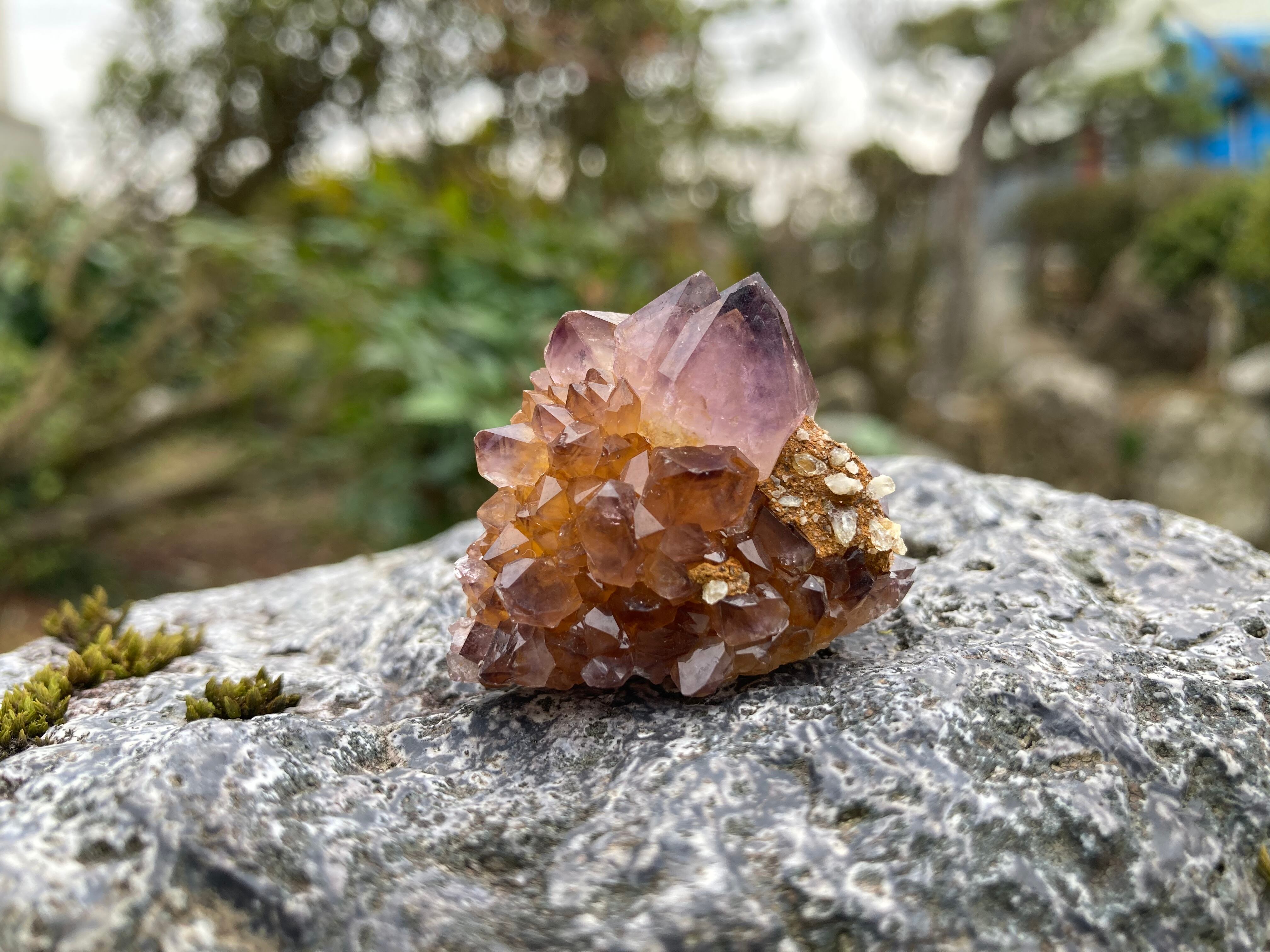 南アフリカ産のスモーキーアメジスト、形状はひとつのポイントに細かい結晶が覆ってサボテンのような形のカクタスクォーツ(スピリットクォーツ)になっています。