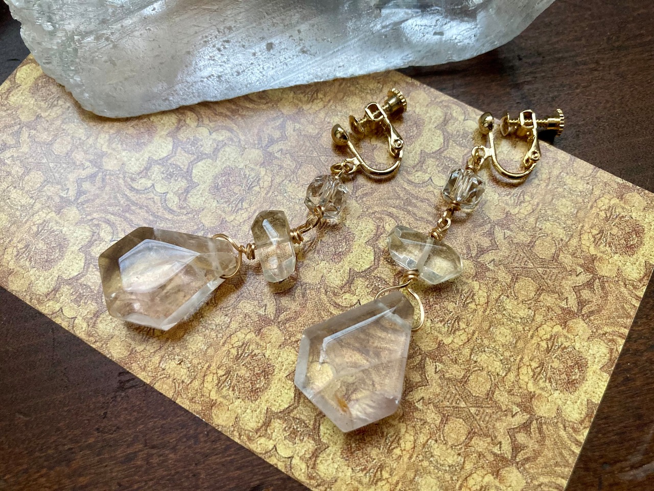 ドロップ型の水晶を使用した、透明感のある大ぶりのイヤリングです。